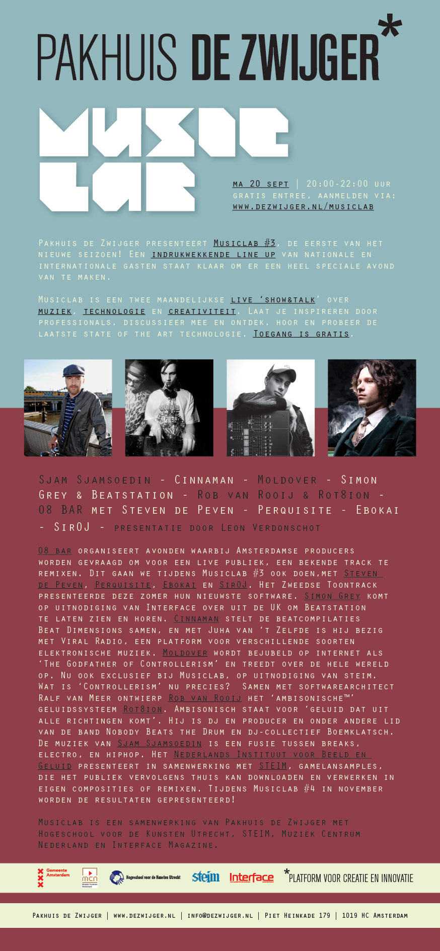 Op maandag 20 september vindt de derde editie van MusicLab plaats in Pakhuis de Zwijger Amsterdam. Interface presenteert er twee items: Rob van Rooij demonstreert het spectaculaire ambisonische Rot8ion 8.1 geluidssysteem en Simon Grey komt over uit de UK om het nieuwe virtuele workstation Beatstation van Toontrack te presenteren. Verder tijdens deze Musiclab: Sjam Sjamsoedin (Nobody Beats The Drum), Cinnaman (Viral Radio), Moldover (Godfather Of Controllerism) en er is een 08bar met producers Steven de Peven, Perquisite, Ebokai en SirOJ.
