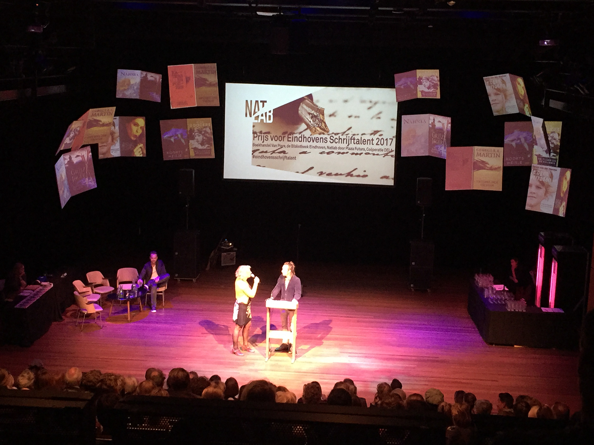 Prijs voor Eindhovens Schrijftalent, Natlab, 9-11-2017. Projection mapping installatie met zwevende boeken met geanimeerde pagina's.